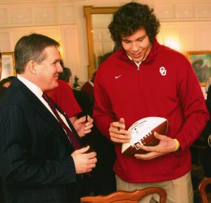 It must be rough to work down at the Capitol! My Senator got to hang out with the Heisman Trophy winner twice in a twenty-four hour period of time. The first time they spoke Cherokee and I took a photo. This week at the marble palace…well, the Senator’s expression speaks volumes.
