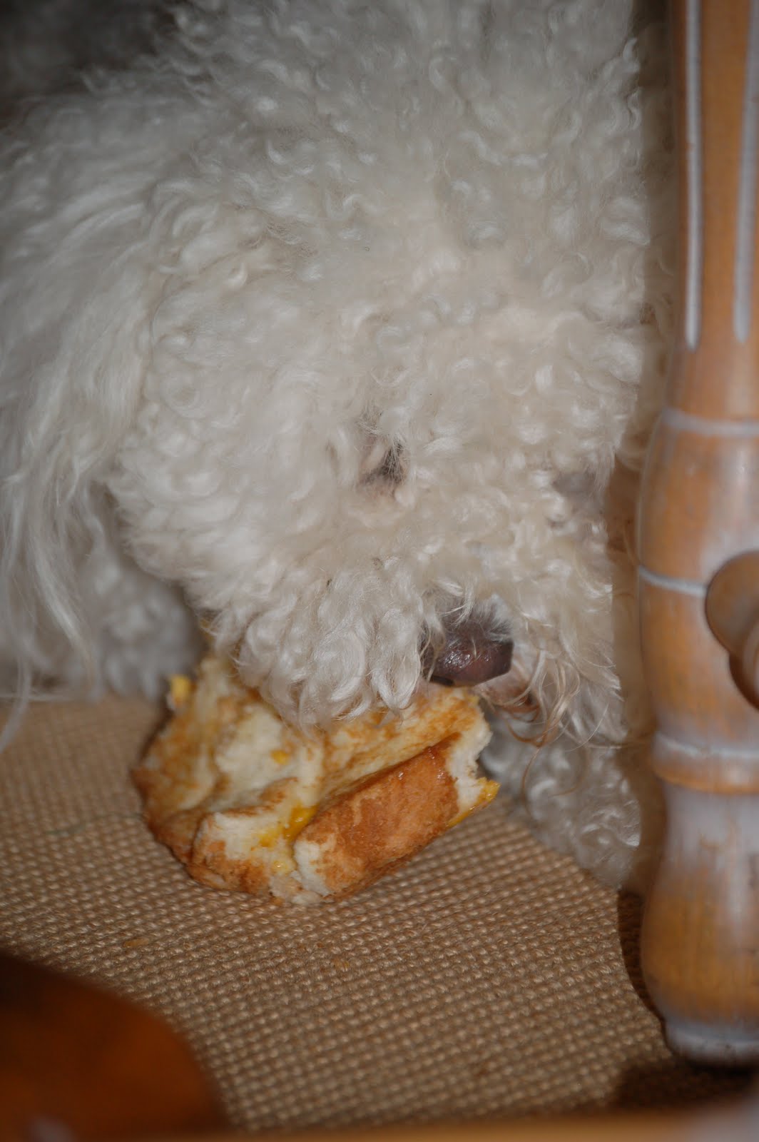 Yes, that is a grilled cheese sandwich in his mouth!