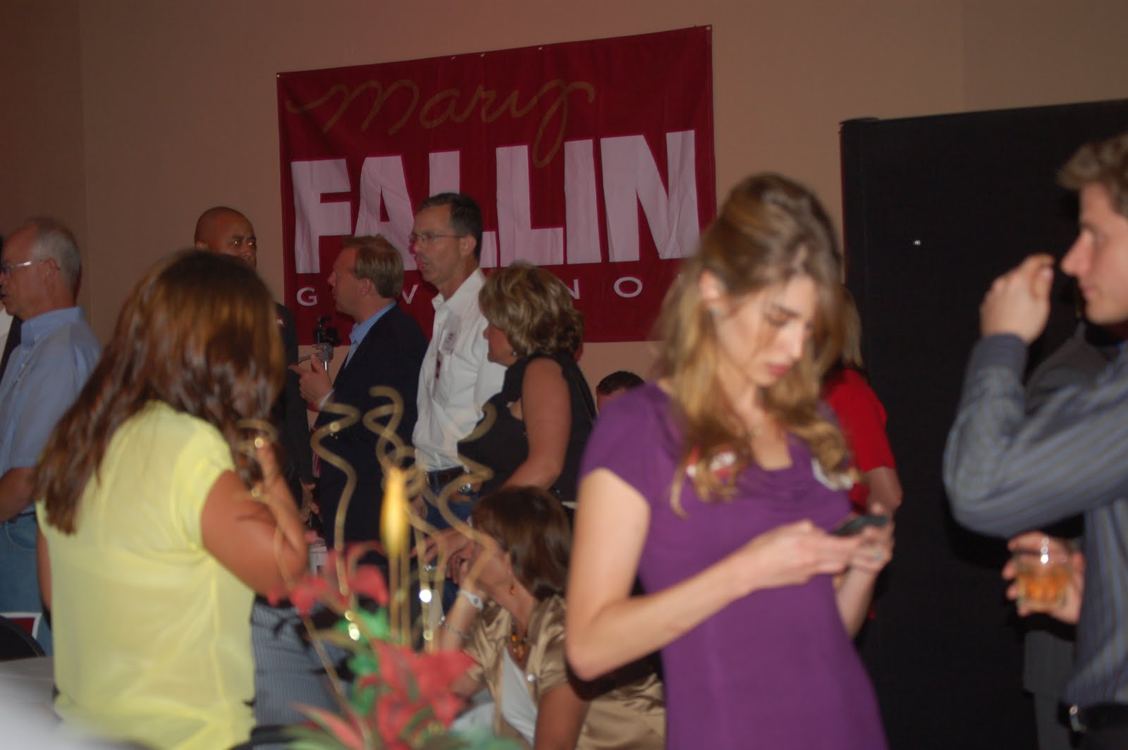 This is where it got interesting. After a while I tired of all the political talk and began watching the people in the very crowded room. It had been a long time since I had seen Republicans have this much fun….when I noticed the girl in the purple dress pictured below texting on her cell phone. She and her male friend to the right appeared somewhat out of place. I had observed them for quite some time as they were young, attractive, very professional like and oh, so serious….more importantly, they were all about their business and did not seem to know anyone or speak to anyone there. Not a soul….they simply studied the crowd and took pictures on their cell phones….Did they just stumble in off the street? Had they walked in from the restaurant next door? Or, were they operatives from the “other” party…..