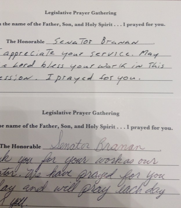 …because that’s what he does if you happen to be walking with him around that historic building! Anyway, while he was assuming the role of Capitol tour guide, I happened to notice a few pieces of paper lying on his otherwise very clean, first day of session desk! And, because I was nosey, or just curious, I started to read them and quickly noticed they were from the Senator’s constituents letting him know they had prayed for him on Sunday.