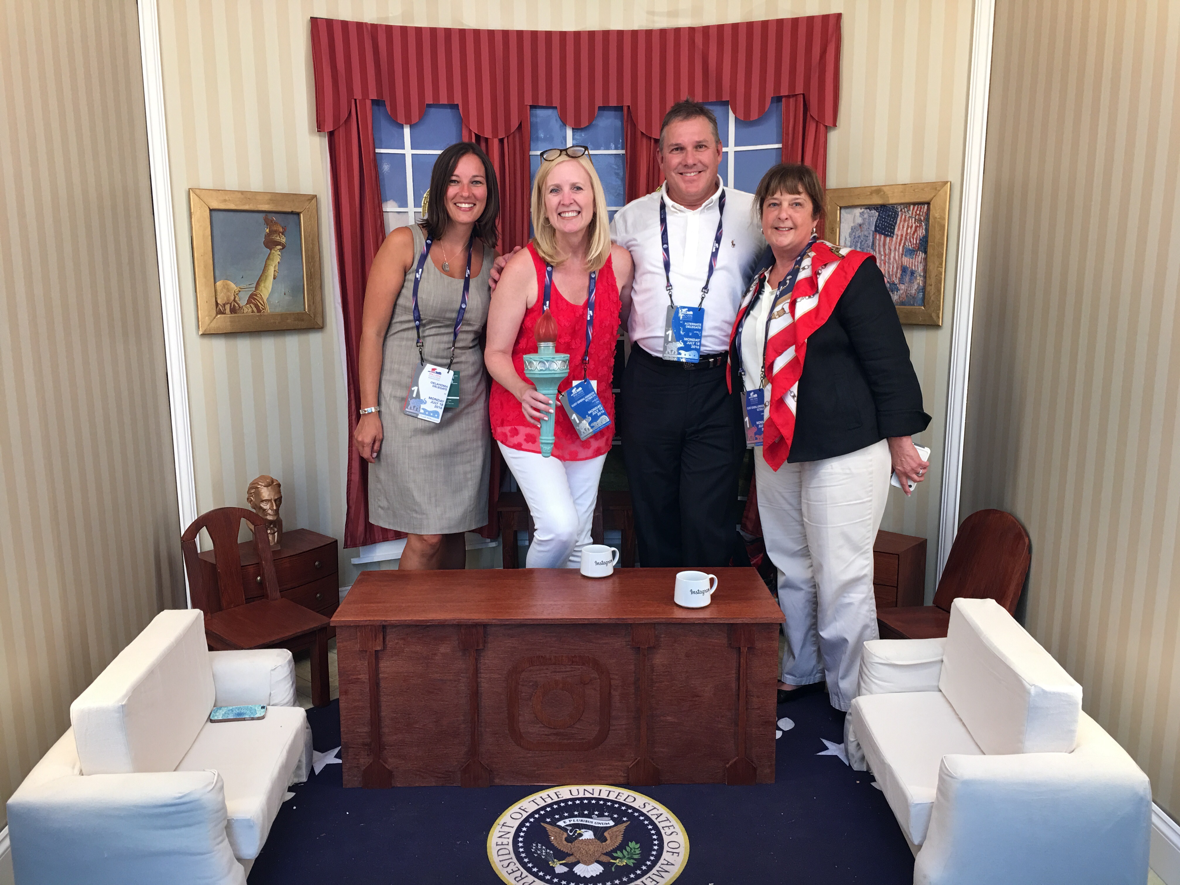 We found the Facebook tent mid afternoon and their adorable intern from Northwestern (and his boss) allowed us to charge our phones while we enjoyed a cold beverage and chilled before the prime time speeches. They also explained a little Facebook live challenge they had going on a took a party pic of a few of us in their “Oval Office!”