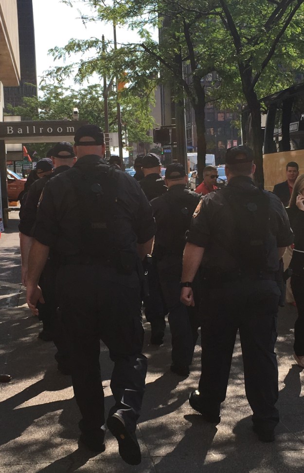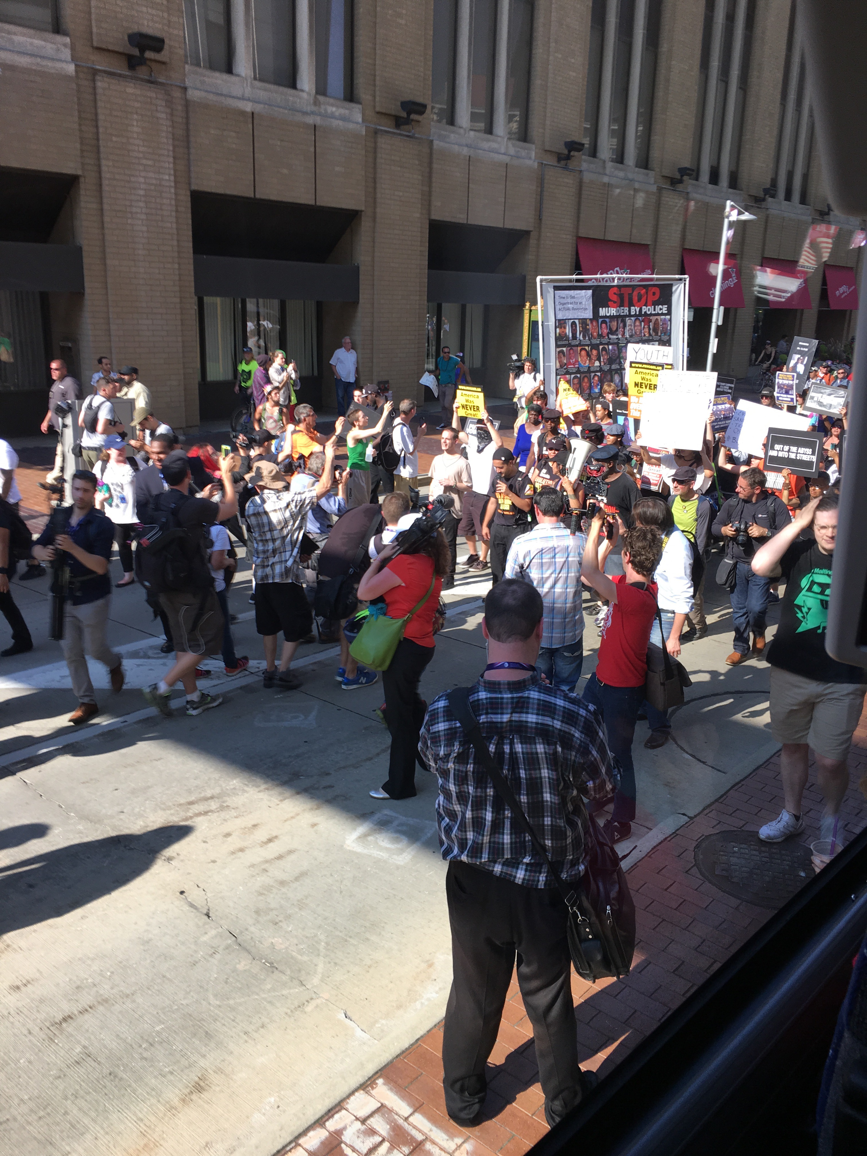 A group of protestors were being allowed to halt traffic up ahead. When I say ” group,” I mean around 50 max. The police appeared to let them stand in the road for what seemed like a staged media opportunity. Then, just like that, the police escorted them off of the road and down the sidewalk where we watched and the hungry media followed. I am sure the headline somewhere read ‘thousands of angry protestors blocked convention delegates,’ but it was nothing like that! There were twice as many police and more cameras than protestors. And for the life of me I couldn’t figure out what they were protesting based on their signs and chants…not sure they knew either.