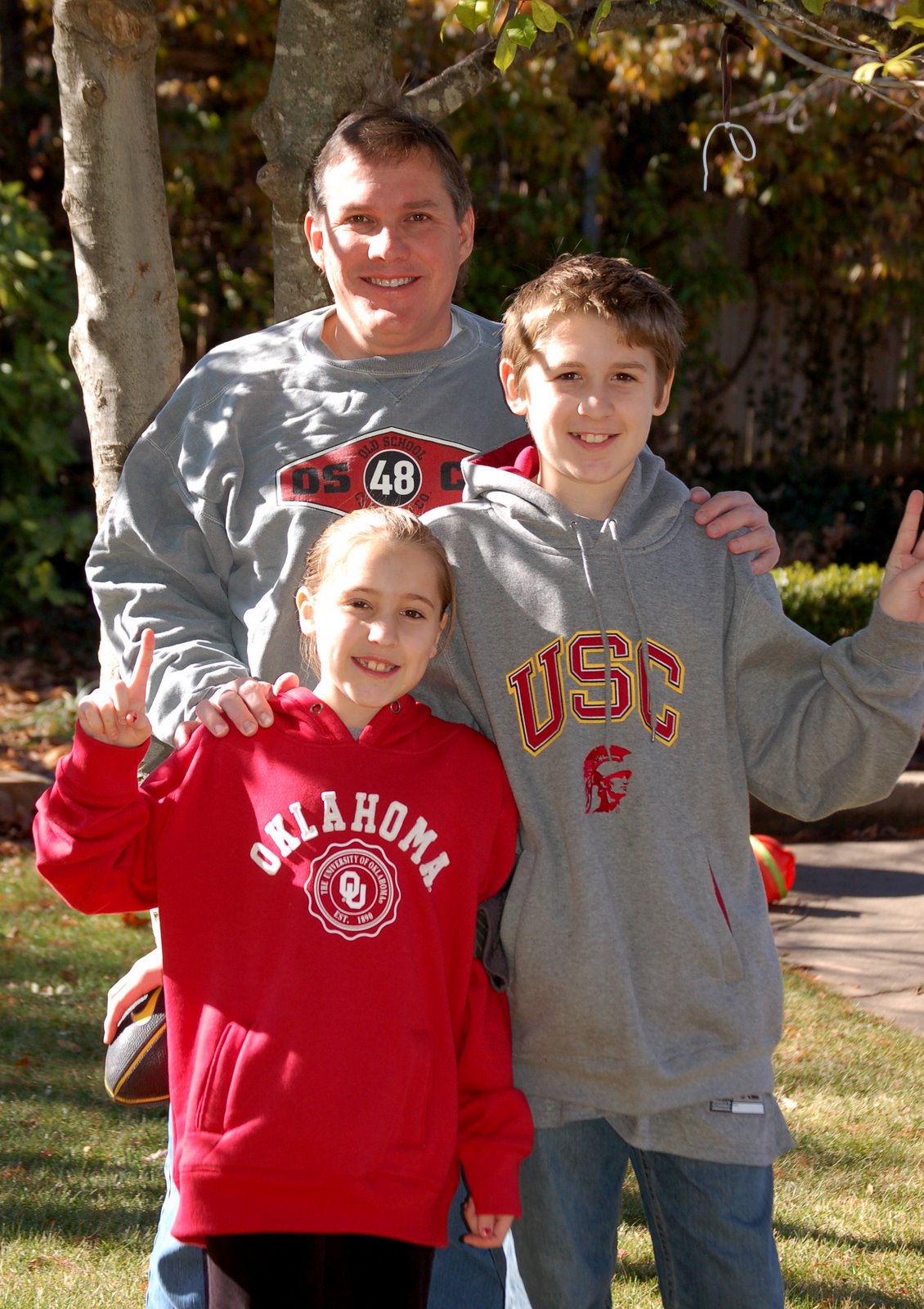 See that guy hiding in the back of the photo posted below? He is trying to remain neutral about this college football conflict. But, I know better. I really do.
