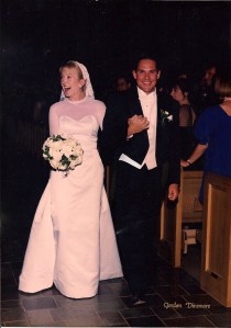 I love this photo of our wedding for many reasons, but the best is what you don’t see in the picture. Aside from the big grin and wide smiles on our glowing face, while we were strolling down the aisle and out of the church the Senator had a little wardrobe mishap. Yes, the vest he was wearing under his jacket decided it would fly the coop and pop off. Bing, just like that, and timed its release right at the moment this terrific photo was being taken.