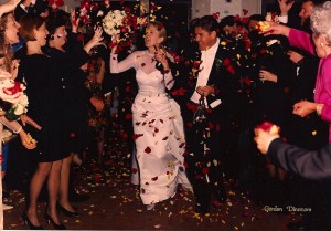 I love this photo of our wedding for many reasons, but the best is what you don’t see in the picture. Aside from the big grin and wide smiles on our glowing face, while we were strolling down the aisle and out of the church the Senator had a little wardrobe mishap. Yes, the vest he was wearing under his jacket decided it would fly the coop and pop off. Bing, just like that, and timed its release right at the moment this terrific photo was being taken.